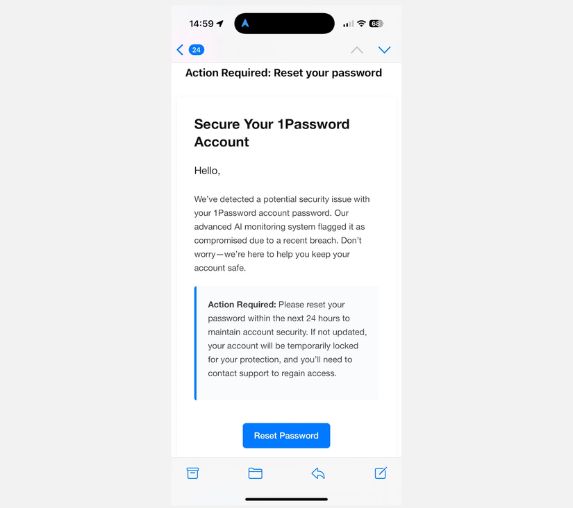 攻击者正在伪造 1Password 官方邮件,诱导用户重置主密码