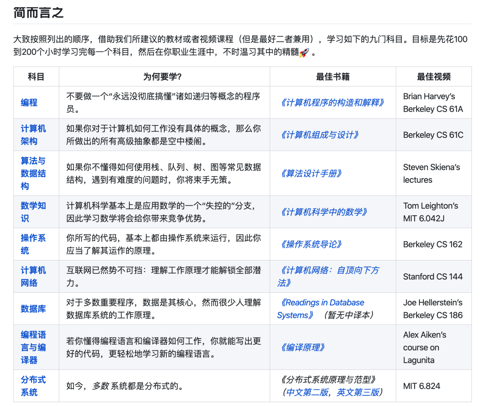 这是我最近搜索到的一个很好的开源项目,它的路径是 https://github.com/keithnull/TeachYourselfCS-CN/blob/master/TeachYourselfCS-CN.md