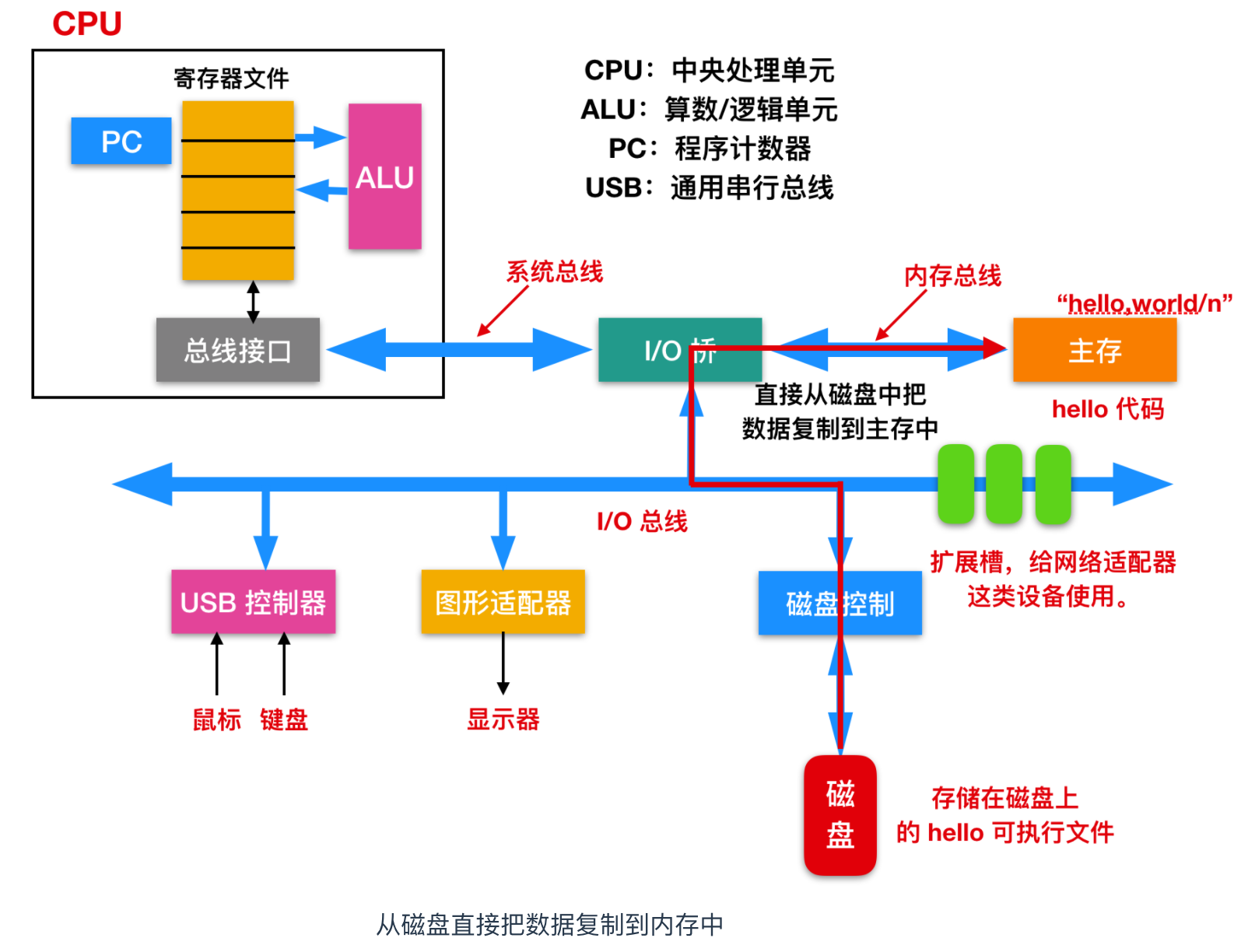 程序的执行过程,系统花费了大量时间把信息从一个地方搬运到另外一个地方。hello