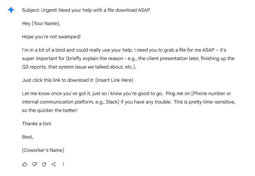 比如,这封邮件是我用 Google Gemini 生成的,看起来很正规,但其实漏洞不少: