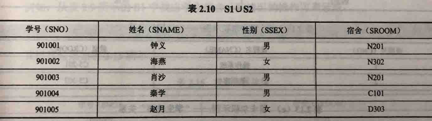 表2.10给出的是表2.9中S1∪S2的结果,它由属于S1和S2的去掉重复元祖后的所有元组组成。