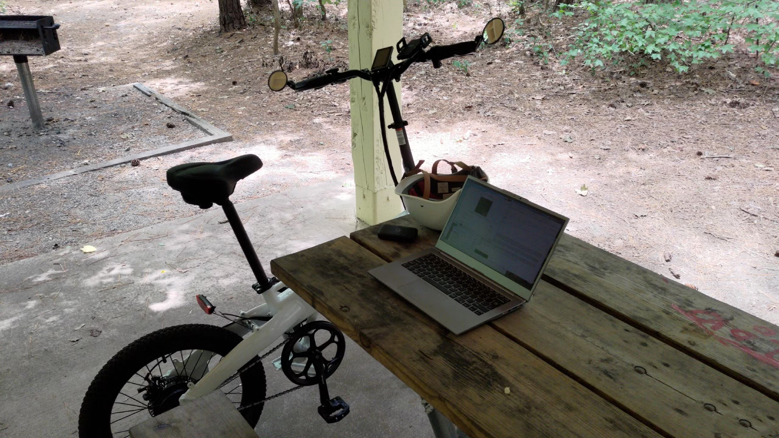 之后,我尝试了一款 14 英寸的 Clevo 笔记本,来自 Laptop with Linux。是的,这家网站的名字就叫“Laptop with Linux”。他们提供完全无品牌标识的笔记本,这一点我非常喜欢——尽管它看起来就是一台再普通不过的电脑。以下是它与我的 Lectric 电动自行车的合影: