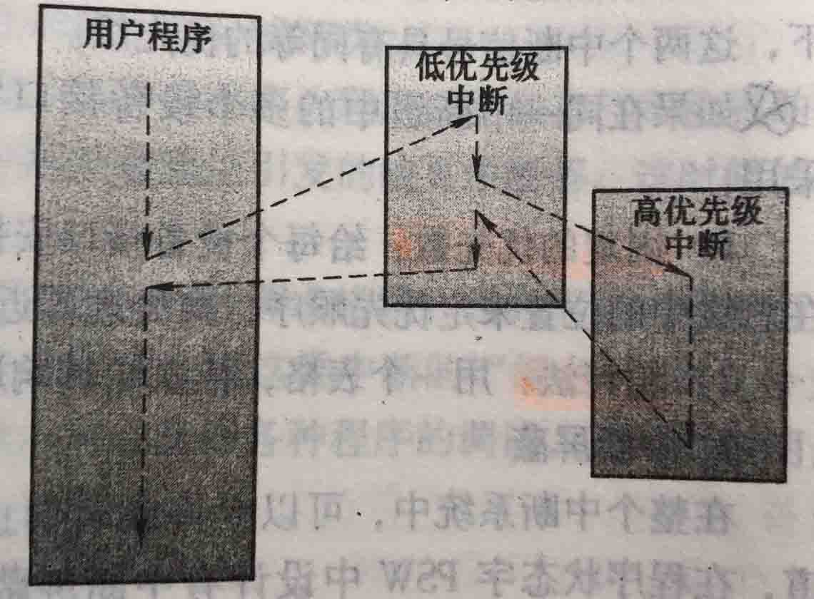 对于多个中断进行处理的第二种策略是中断嵌套。即中断按照优先度分级,允许优先级较高的中断打断优先级较低的中断处理过程,于是引起中断处理的嵌套。