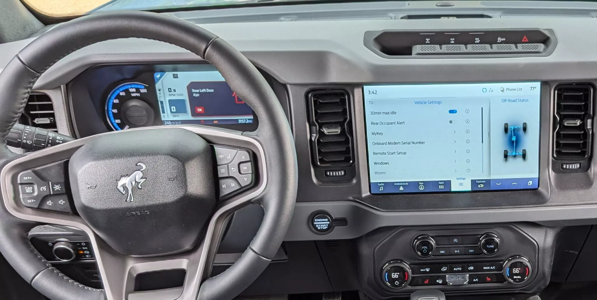 福特为整个 Bronco 系列配备了 12 英寸信息娱乐系统。在我们的使用中,它快速、直观且布局合理。驾驶员信息屏幕也很好,尽管导航不太容易。福特在沼泽地提供了几种驾驶模式,包括沙地/雪地、岩石爬行、泥地/车辙等。