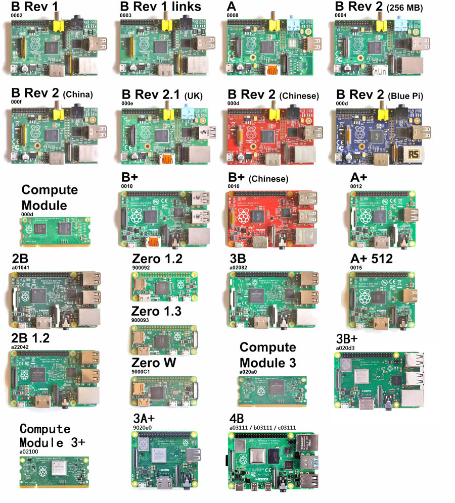 最早的一组树莓派版本代号预设了从 0002 到 0015 的连续 16 进制版本代号: