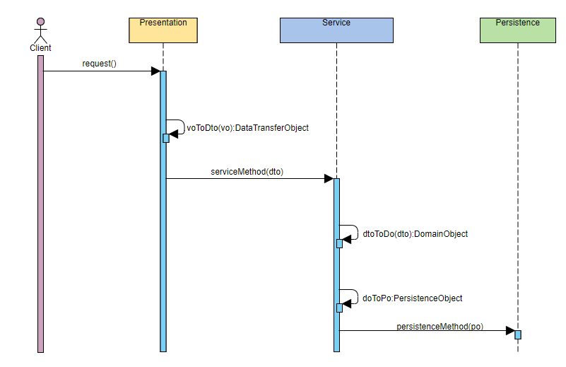 - 服务层把 DO 转换为持久层对应的 PO(可以使用 ORM 工具,也可以不用),调用持久层的持久化方法,把 PO 传递给它,完成持久化操作。