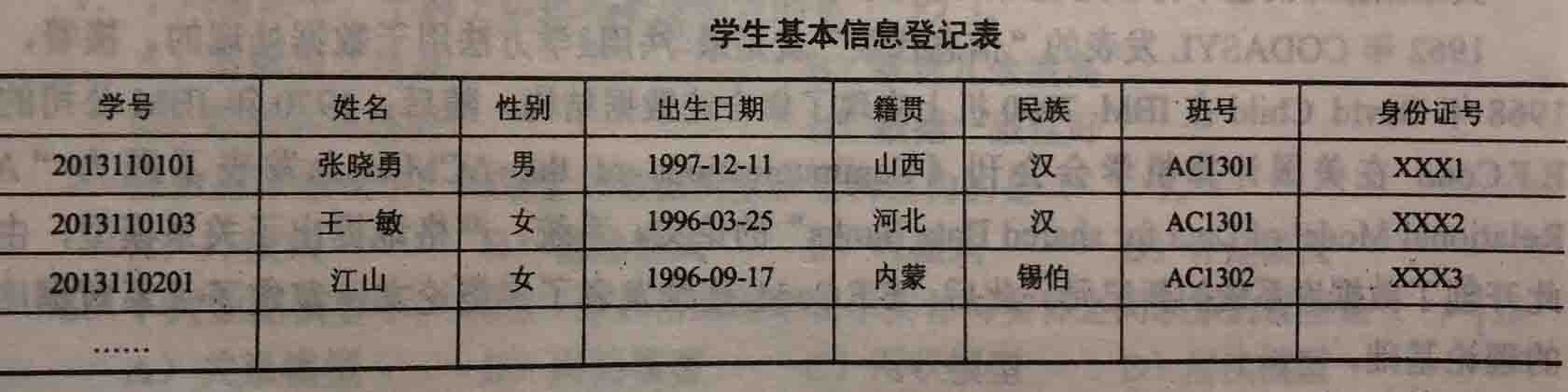 表中的一行即为一个元组。例如,学生基本信息表中的元组有: (2013110101,张晓勇,男,1997-12-11山西,汉,AC1301,XXX1),(2013110103,王一敏,女,199603-25,河北,汉,AC1301,XXX2),(201311020,江山,女,19960917,内蒙,锡伯,AC1302,XX3)等。