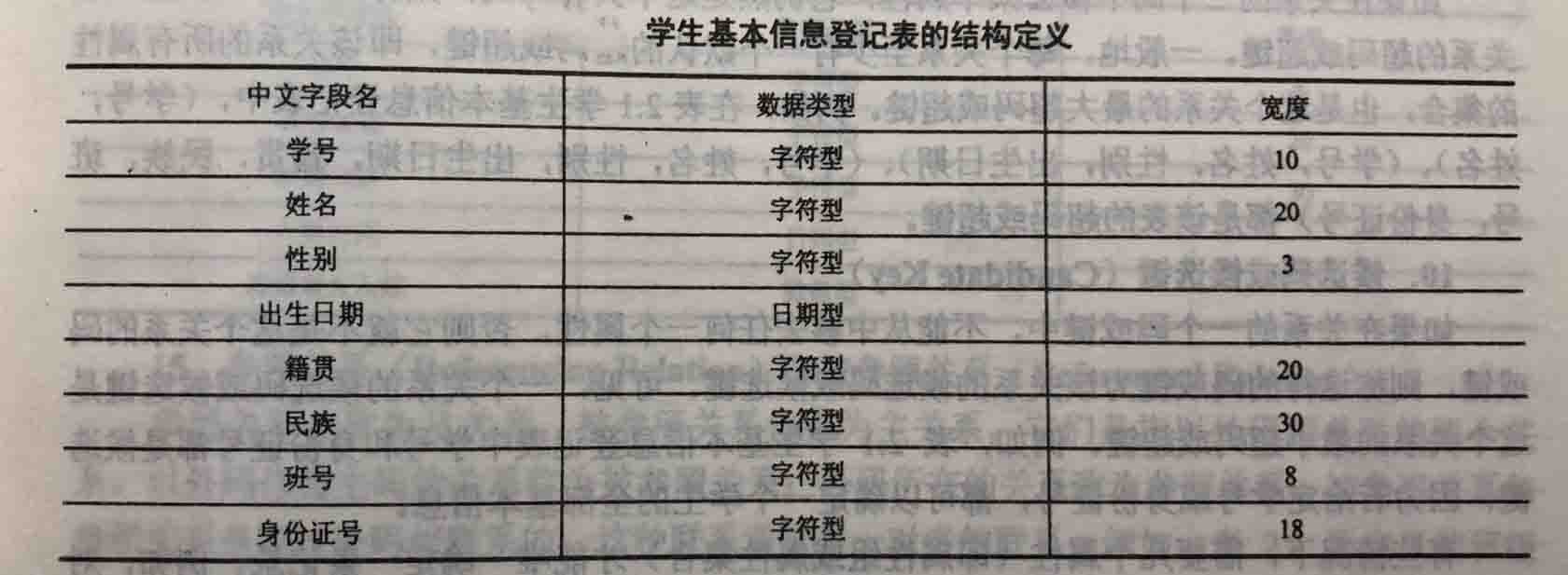 需要注意的是:上述例子中,关系模式的名称和字段的名称均使用的是中文,但在实际的数据库应用系统中,一般不采用中文作为表名、字段名等。这是因为在编写数据库应用程序时,表名、字段名会作为变量名,而使用中文标识不方便,而且更重要的是有些数据库管理系统不能很好地支持中文的表名和字段名。因此,对于学生基本信息登记表的表名,可以命名为英文表达方式