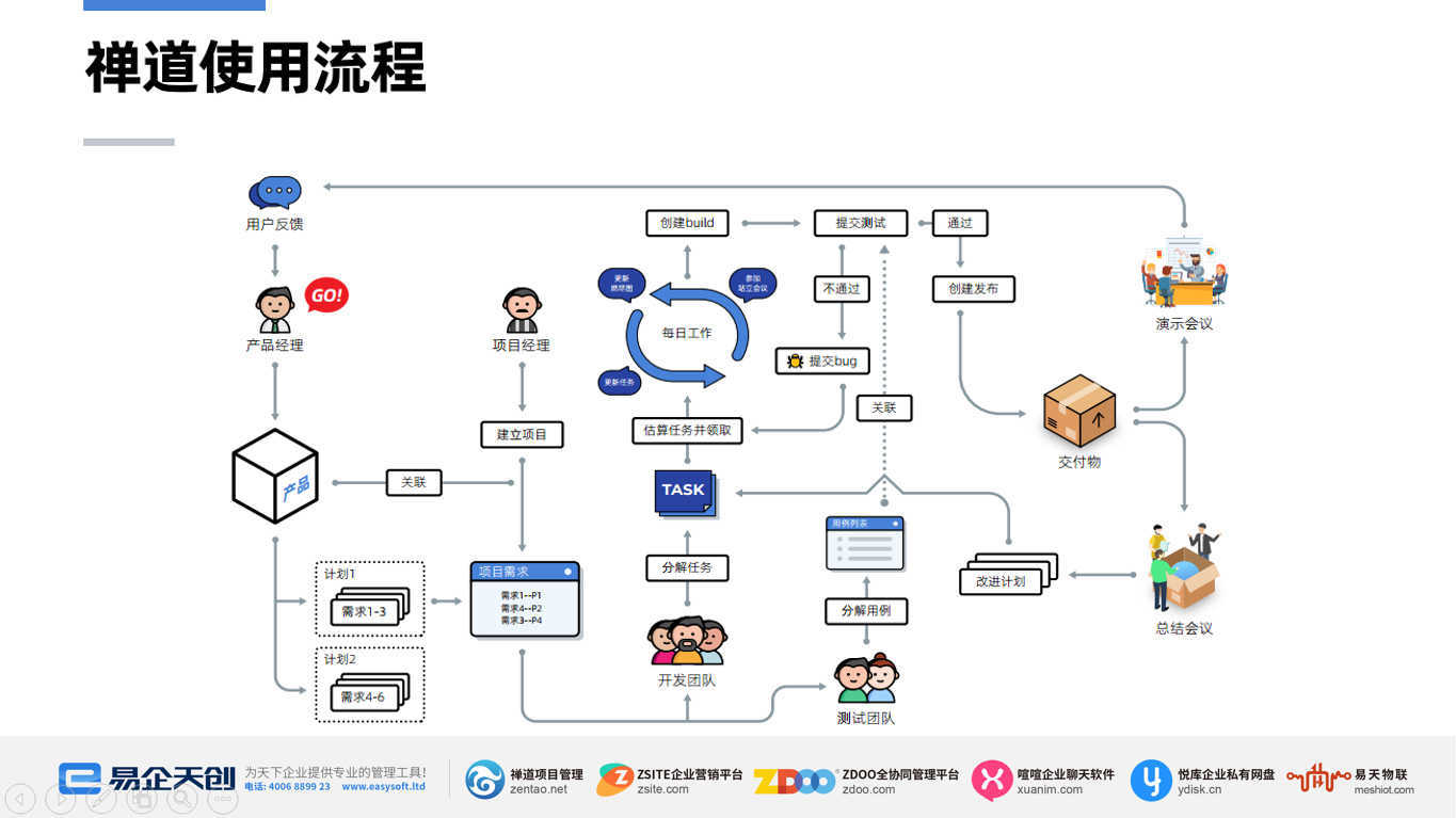 禅道由 青岛易软天创网络科技有限公司开发,国产开源项目管理软件。它集产品管理、项目管理、质量管理、文档管理、组织管理和事务管理于一体,是一款专业的研发项目管理软件,完整覆盖了研发项目管理的核心流程。禅道管理思想注重实效,功能完备丰富,操作简洁高效,界面美观大方,搜索功能强大,统计报表丰富多样,软件架构合理,扩展灵活,有完善的API可以调用。禅道,专注研发项目管理! 它有着很多优点: 1. 禅道是专业的研发项目管理软件,非简单任务管理软件可比。 2. 管理思想简洁实效,可以帮助企业实现快速敏捷开发。 3. 功能完备,您无需再费心整合若干系统在一起使用。 4. 源代码开源开放,有灵活的扩展机制,方便企业使用并二次开发。 5. 国产软件,本地支持,操作习惯更符合国人。 6. 自主开发的底层框架和前端UI框架,健壮稳定,界面美观,交互友好。 7. 完善的社区机制,可以获得及时的技术支持和帮助。 8. 零投入,相比动辄十几万的商业软件,您选择禅道没有任何风险。 9. 禅道支持多种部署方式,可以私有部署,也可以选择云端服务。 10. 我们团队一直专注企业管理,持续迭代更新,不断完善软件。